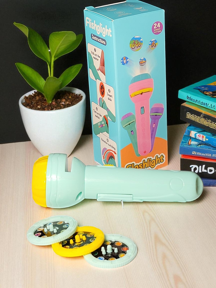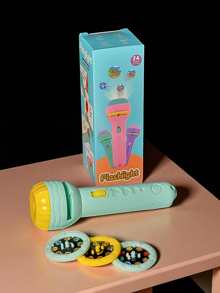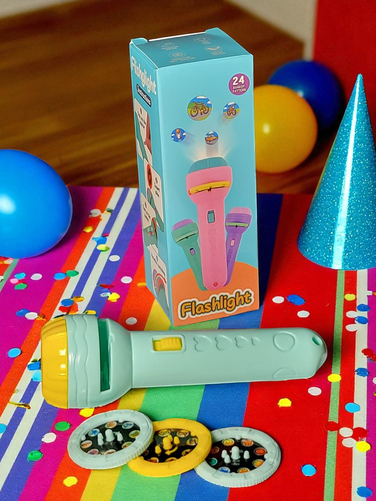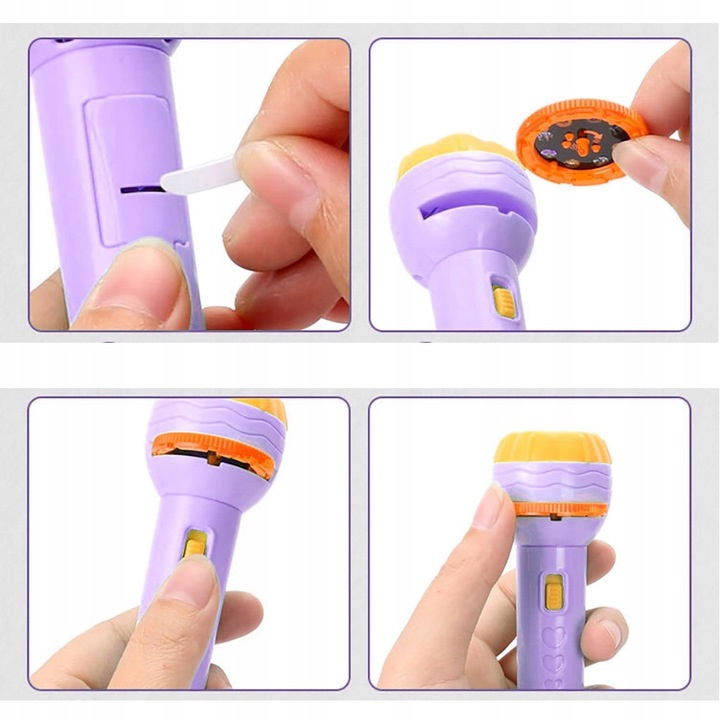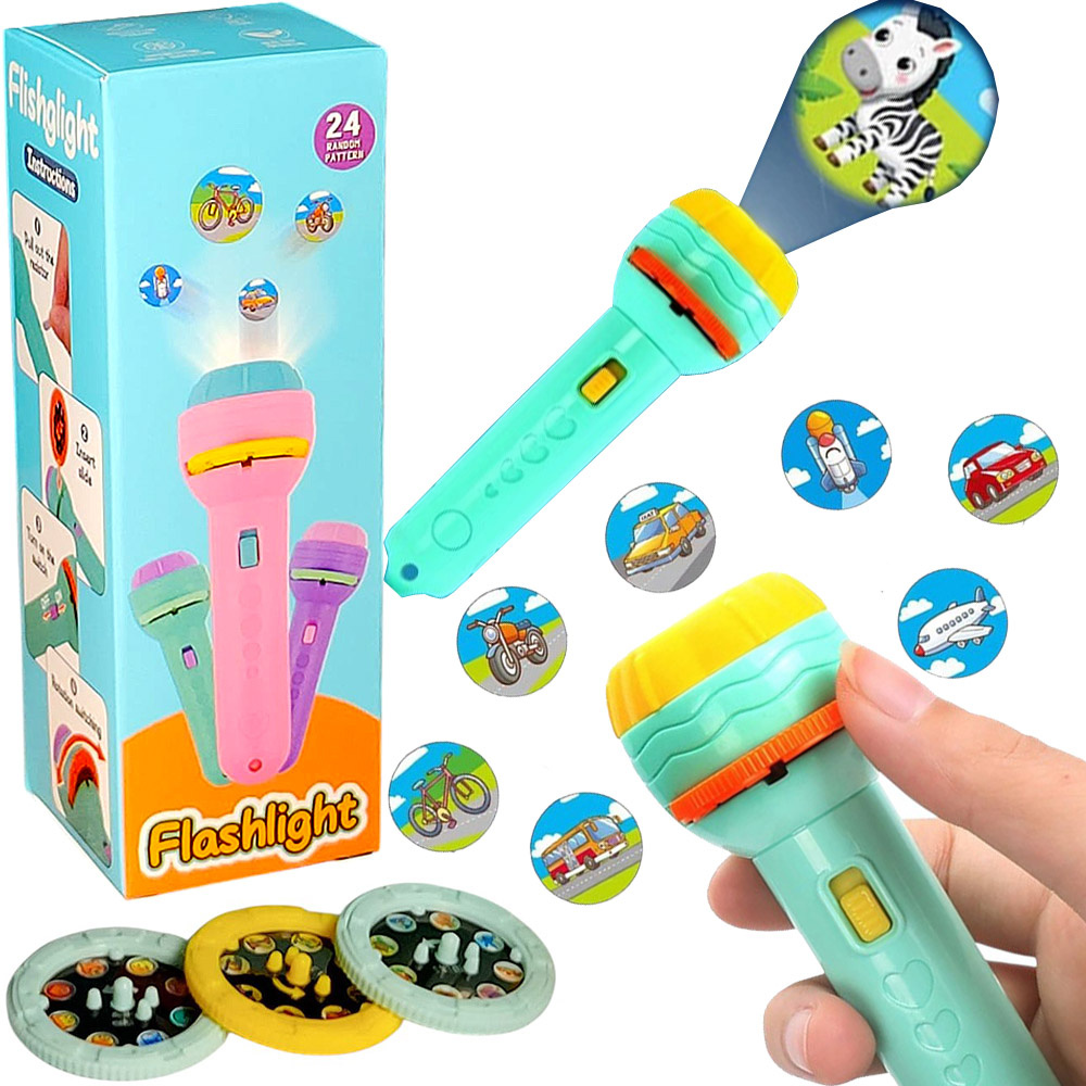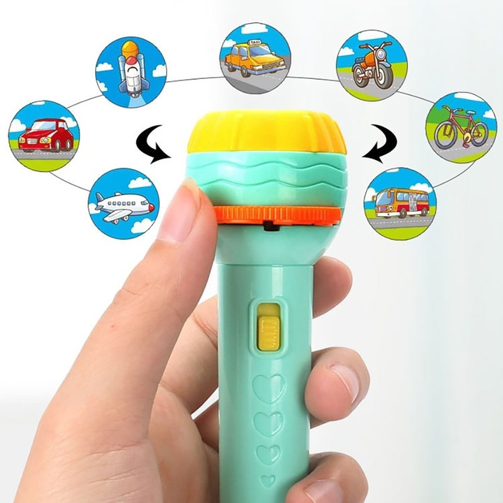 - Ręczny projektor-latarka dla dzieci – wymienne tarcze, 24 slajdy (zwierzęta, pojazdy, itd.). Wyświetlaj bajkowe projekcje na ścianie lub suficie. Bezpieczny, lekki i twórczy gadżet do zabawy i nauki.