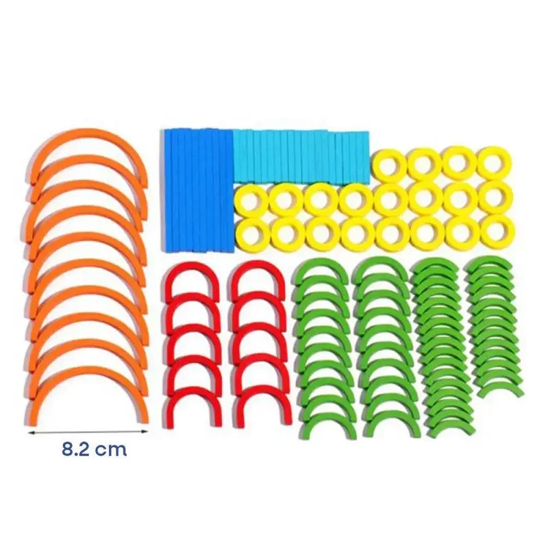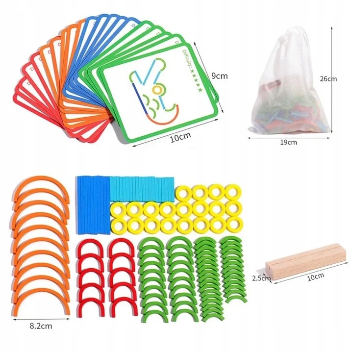 - Zestaw składa się z patyczków, pierścieni i klocków, które można łączyć w różne konfiguracje, tworząc kreatywne wzory i ćwicząc zdolności manualne.