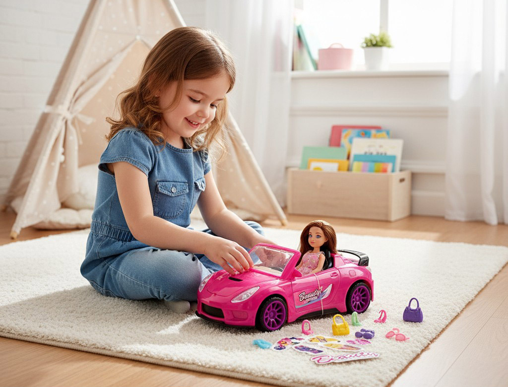 Zabawa z lalką + auto rozwija wyobraźnię – odgrywanie scenek, modowe stylizacje, wyjazdy, zawody.