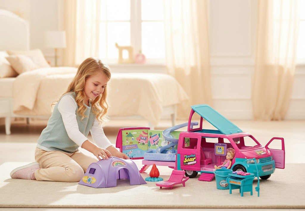 Mobilność + domek w jednym – kamper jest pojazdem i "domkiem" naraz. Dziecko może "jechać" w nowe miejsce, a po dotarciu na „biwak” rozkłada namiot, rozstawia akcesoria, przygotowuje posiłek i wskakuje do basenu (lalka oczywiście!).