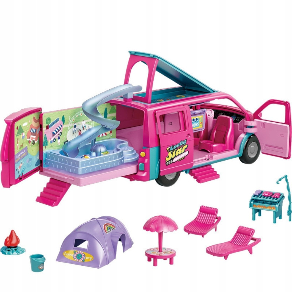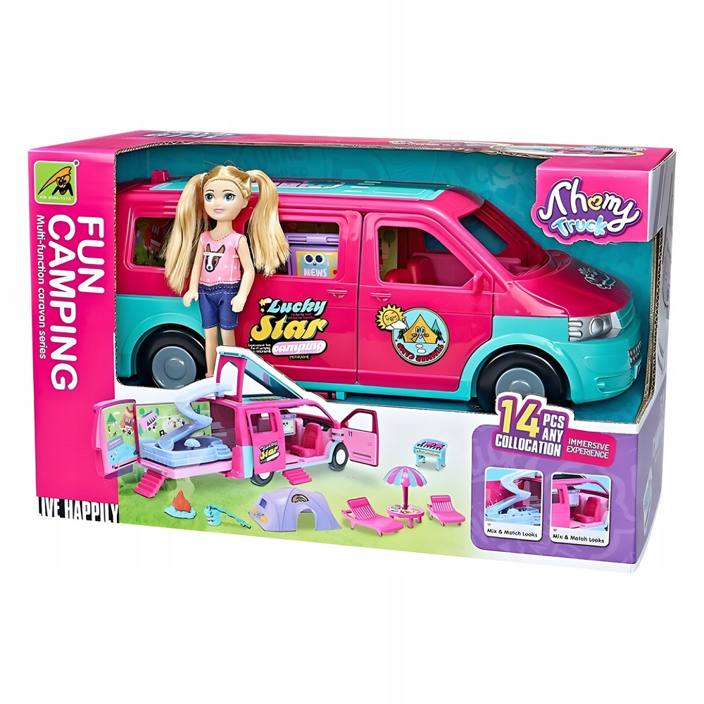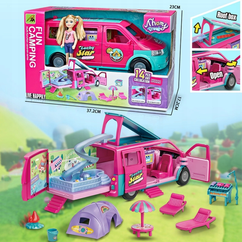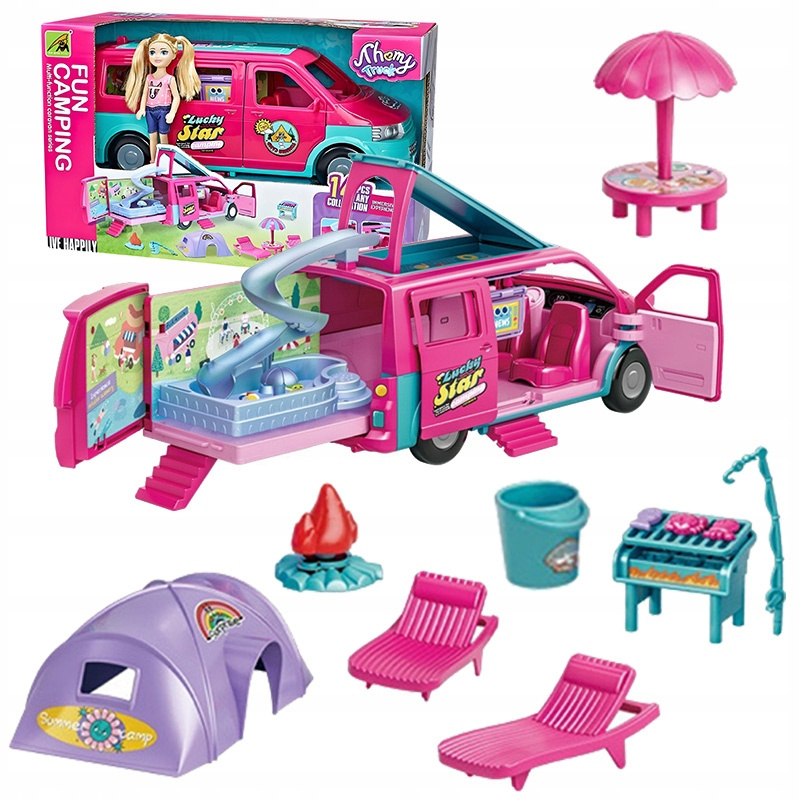 - AUTO KAMPER WAKACYJNY DLA LALEK z namiotem i basenem + LALKA | duży zestaw kempingowy z akcesoriami