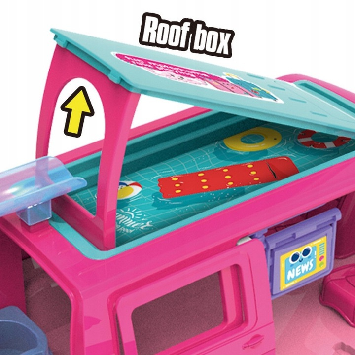 - Duży kamper dla lalek: otwierane elementy, namiot, basen ze zjeżdżalnią, lalka i akcesoria kempingowe. 3+, CE, kompatybilny z lalkami do ok. 14 cm. Idealny prezent!