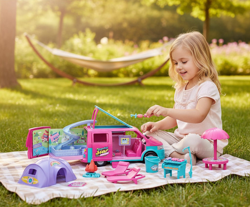 Dla miłośników lalek i scenariuszy zabaw: zestaw łączy pojazd, domek „na kołach”, piknik, wodną zabawę i biwak - różnorodność zwiększa czas zaangażowania.