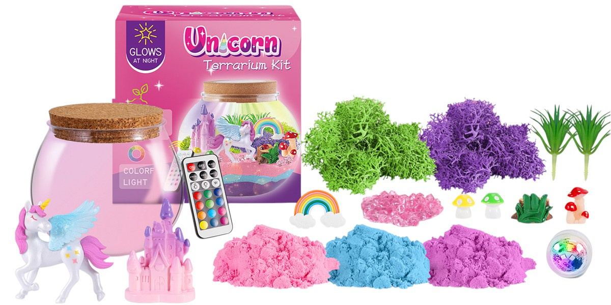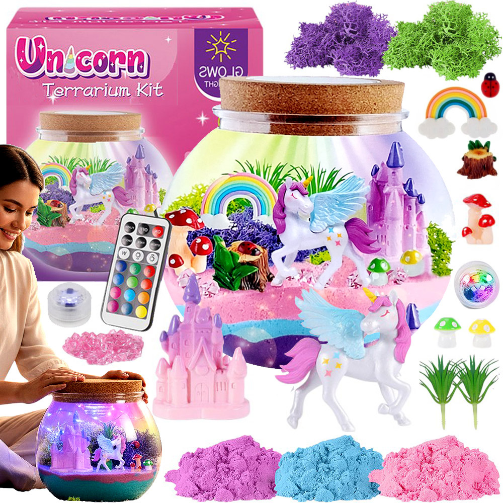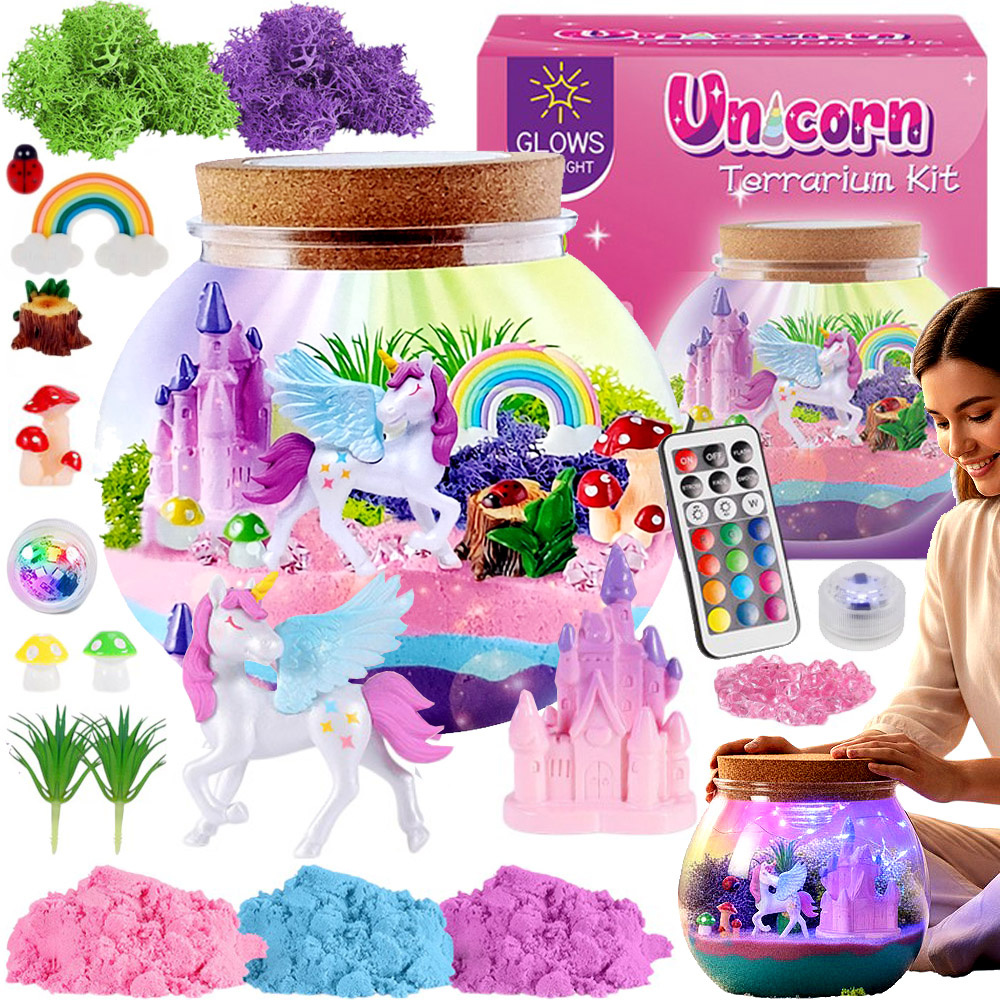 - Terrarium z jednorożcem, lampka LED w 13 kolorach, zestaw kreatywny DIY z eksperymentami – idealny prezent, rozwój ręki-oka, nauka przez zabawę, bezpieczne materiały.