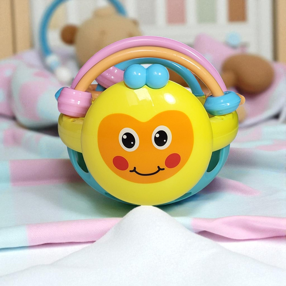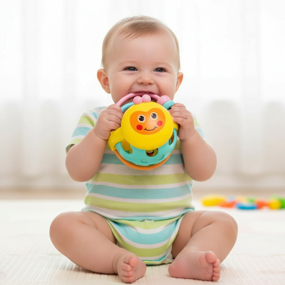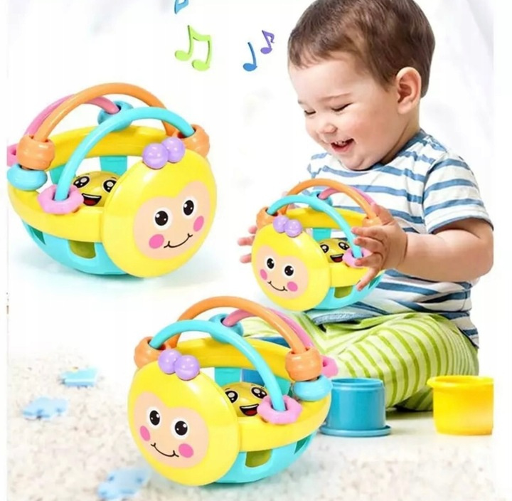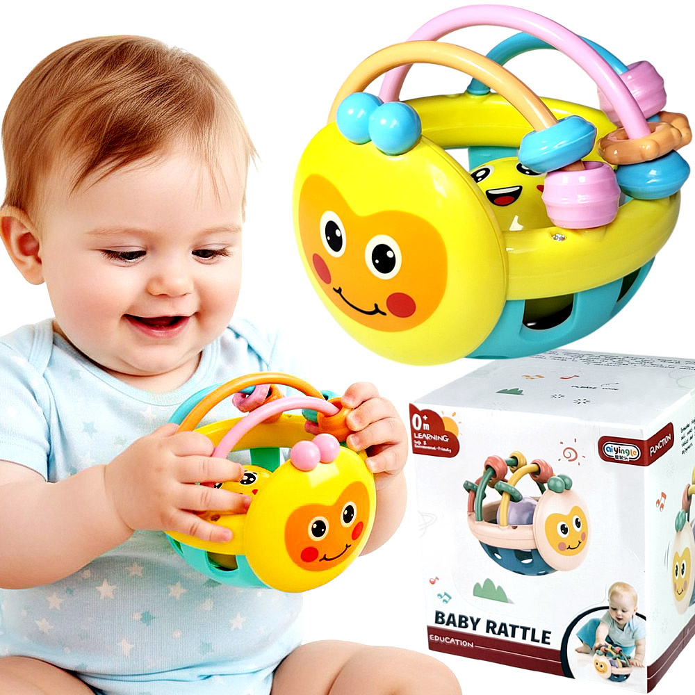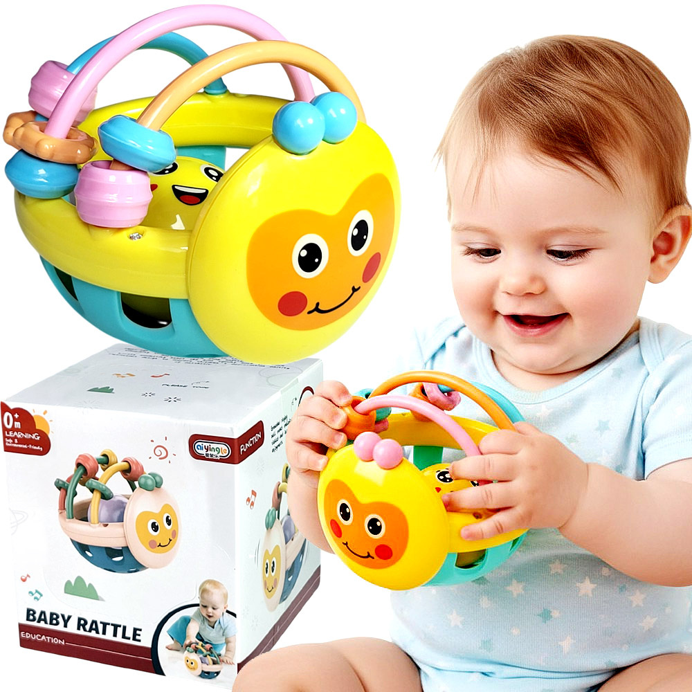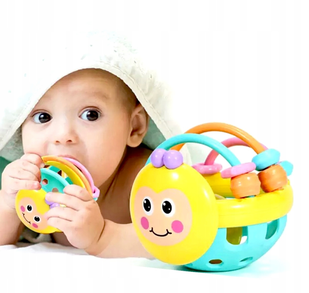 • Zabawka dla niemowlaka: kolorowa grzechotka w formie kuli, pełni także funkcję gryzaka – sensoryczna, bezpieczna, stymuluje zmysł dotyku, wzroku i słuchu. Idealna na prezent dla najmłodszych.