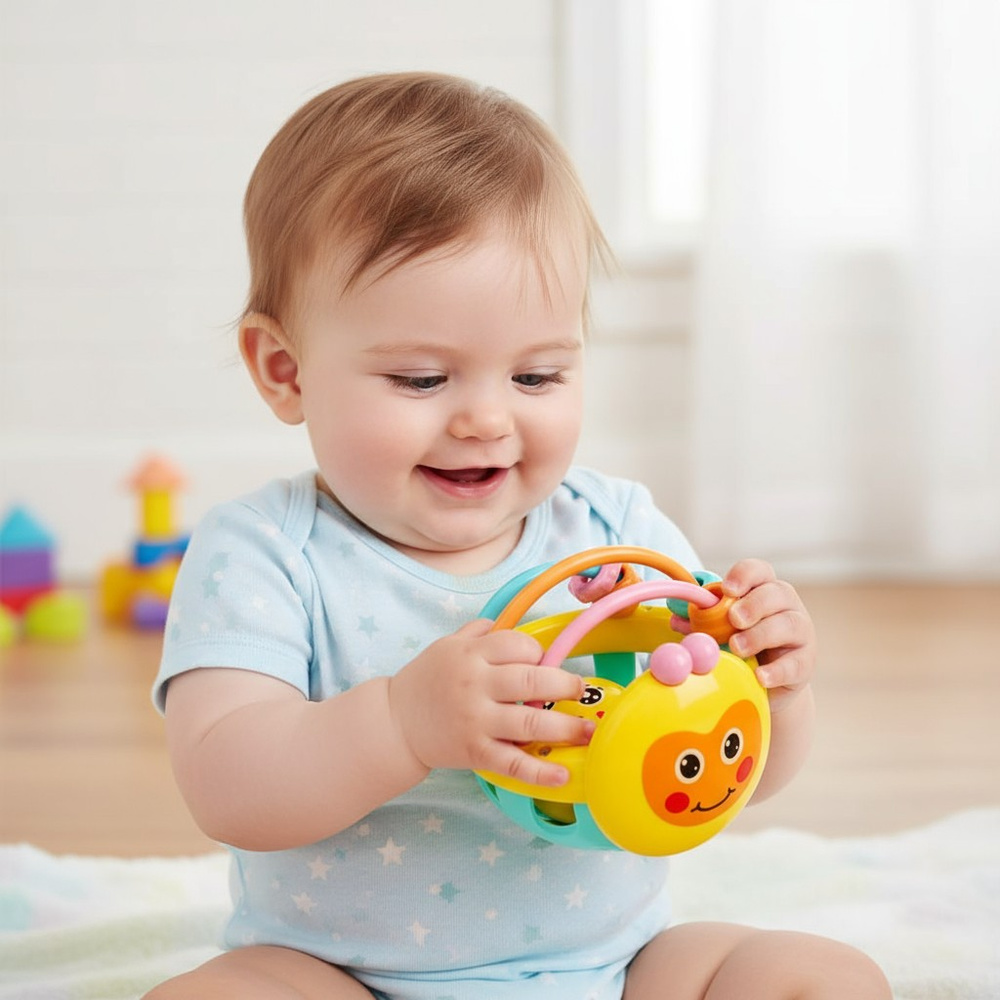 • Wzmacnia motorykę – specjalnie zaprojektowany kształt pozwala na łatwe chwytanie, potrząsanie i toczenie zabawki, co rozwija koordynację ręka-oko.