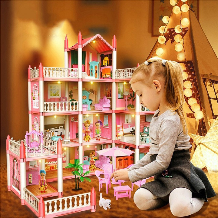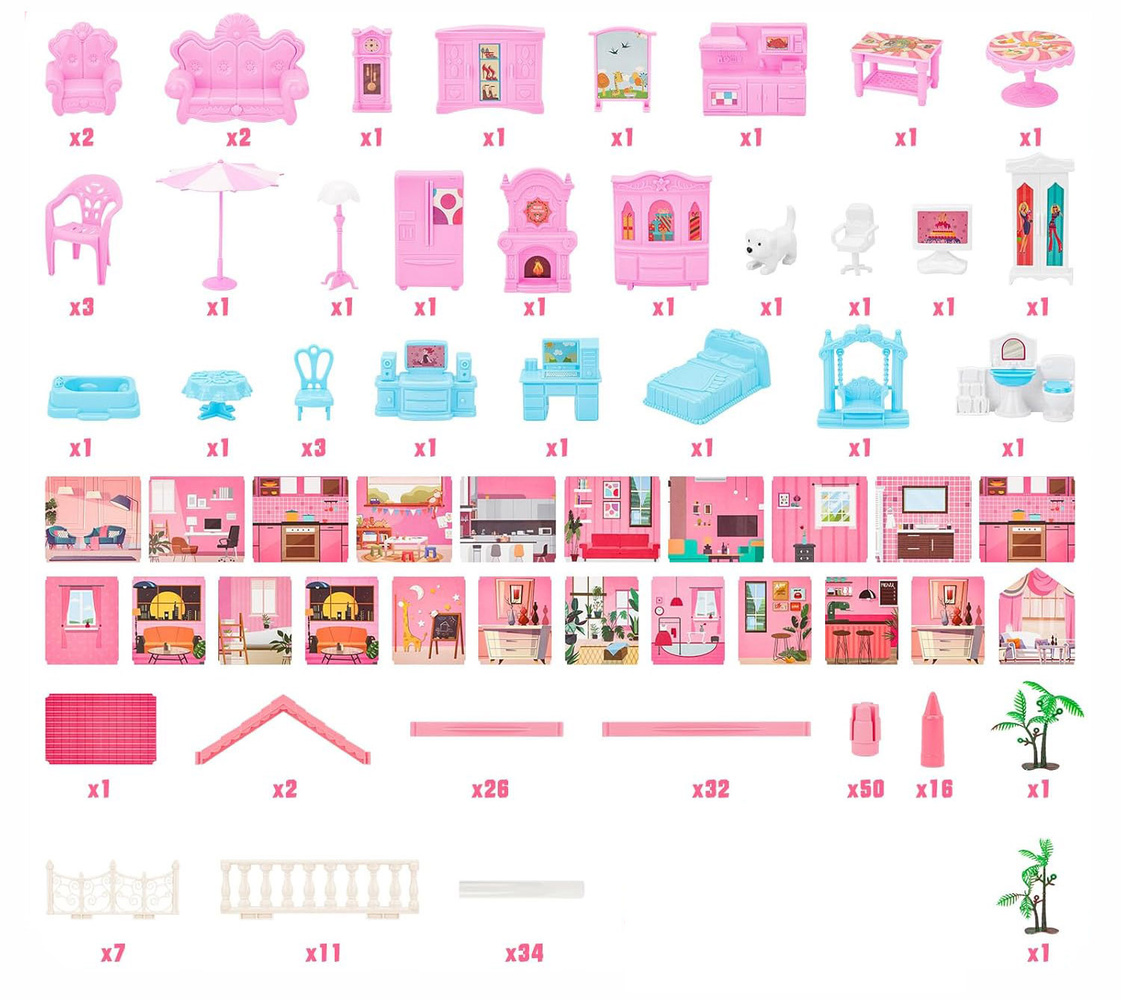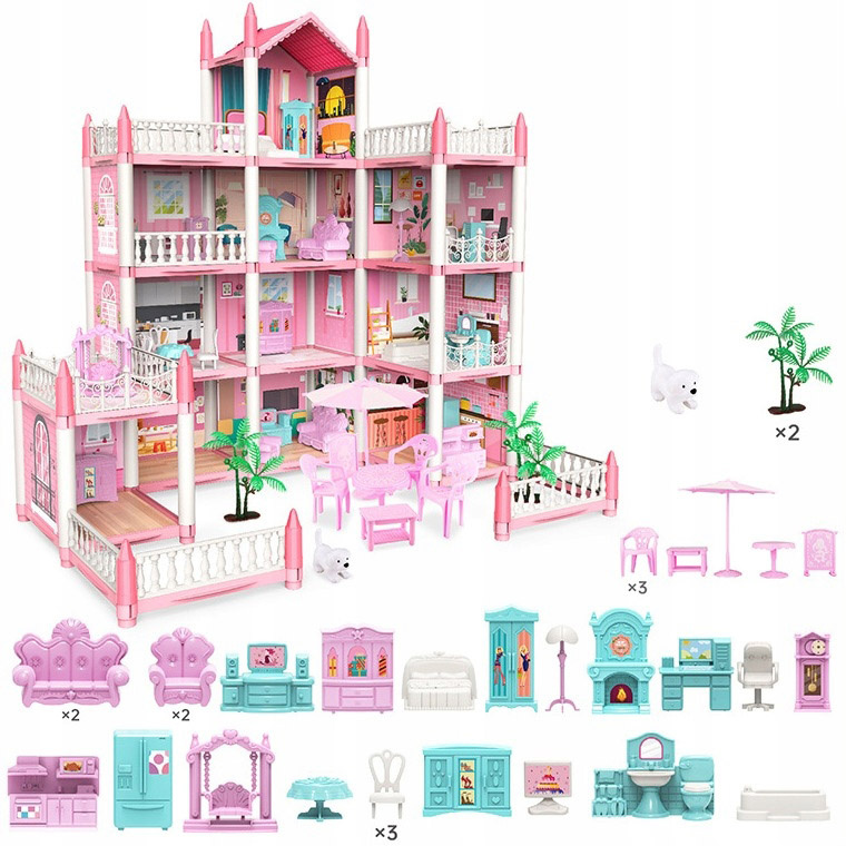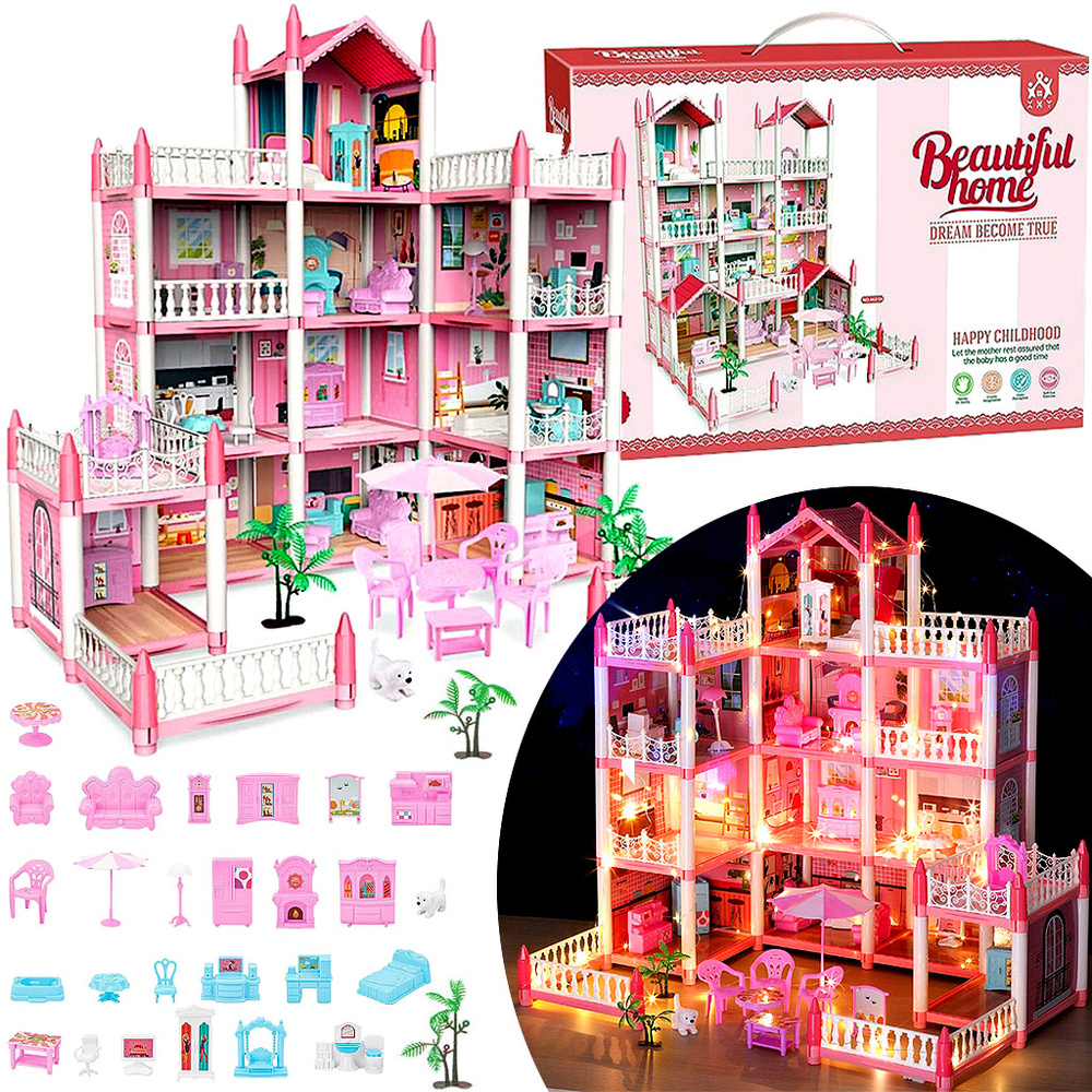 - Wyjątkowy zestaw „Domek dla lalek – 4 piętra, mebelki i akcesoria” światełka LED. Idealny prezent dla dziewczynek od 3 lat: rozbudowana zabawa, aranżacja wnętrz, rozwój kreatywności i wyobraźni.