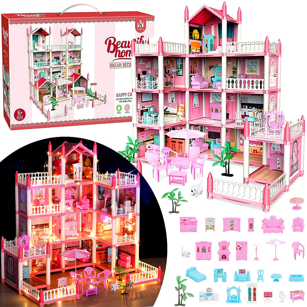 DOMEK DLA LALEK DUŻY ŚWIATŁO LED AKCESORIA MEBLE 4 PIĘTRA + MEBELKI + AKCESORIA
