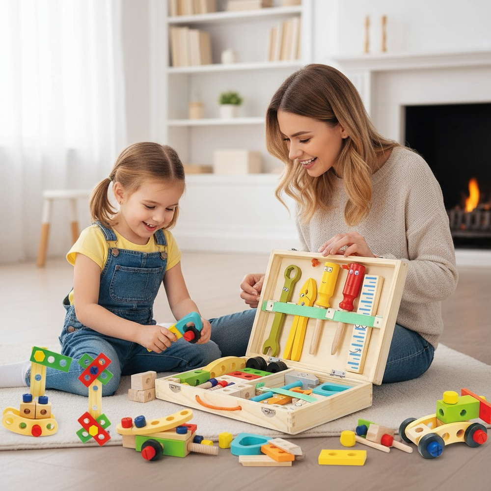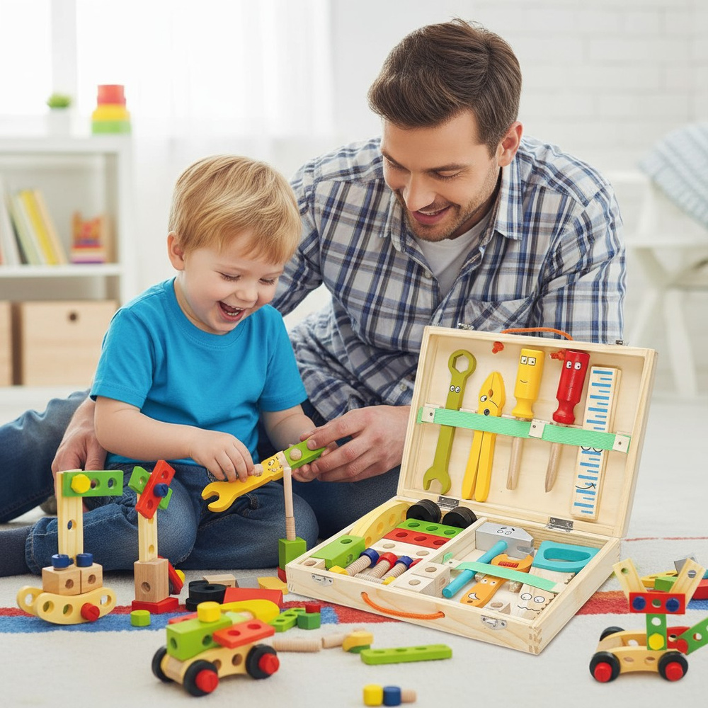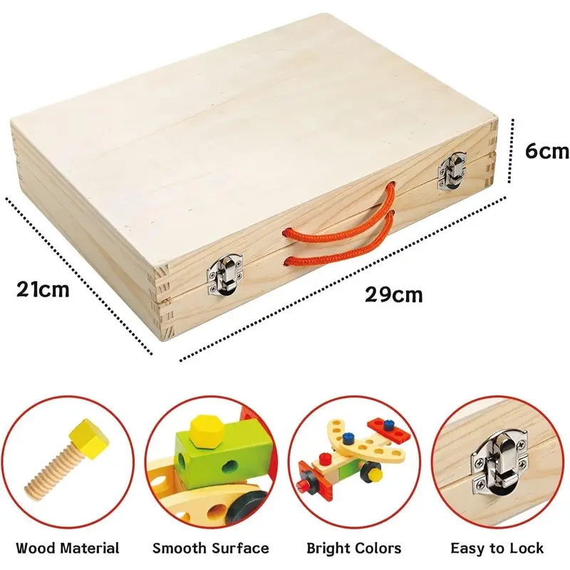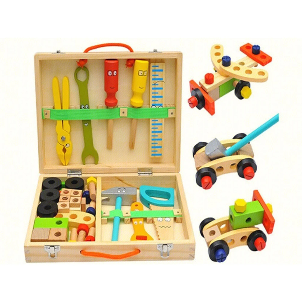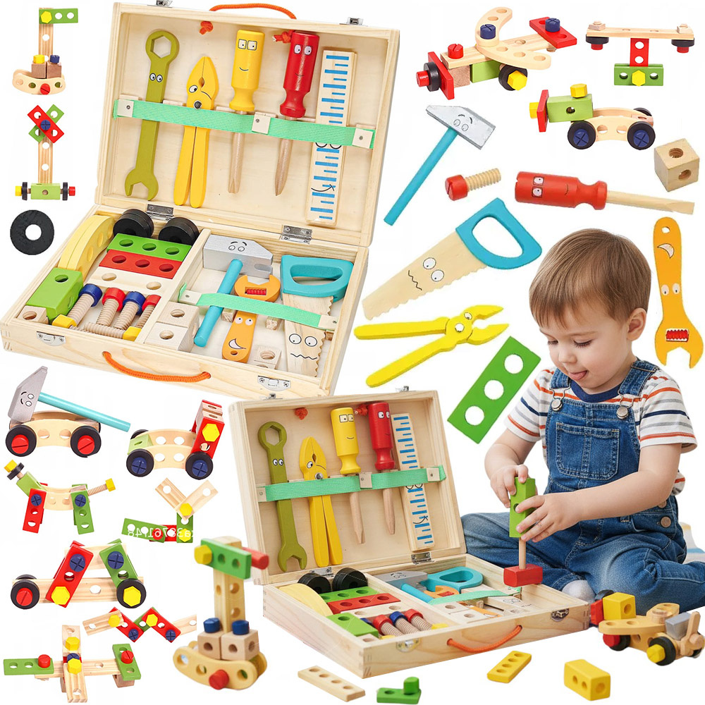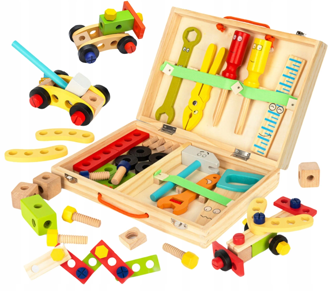 - Zestaw idealny na urodziny, święta lub dzień dziecka. Bawi, uczy i rozwija – a przy tym wygląda pięknie. Drewniane narzędzia w walizce to ponadczasowy hit wśród zabawek edukacyjnych!
