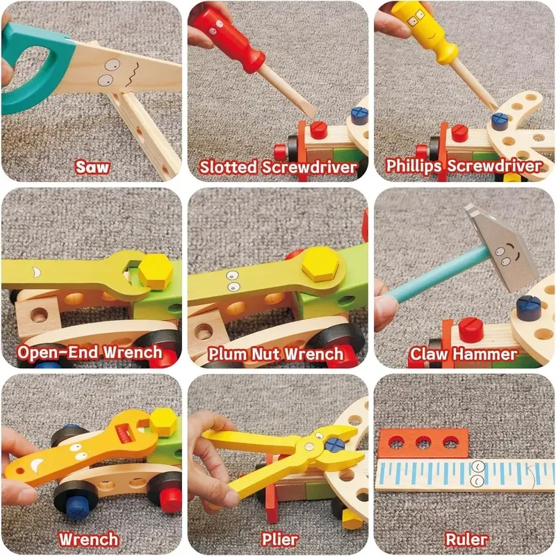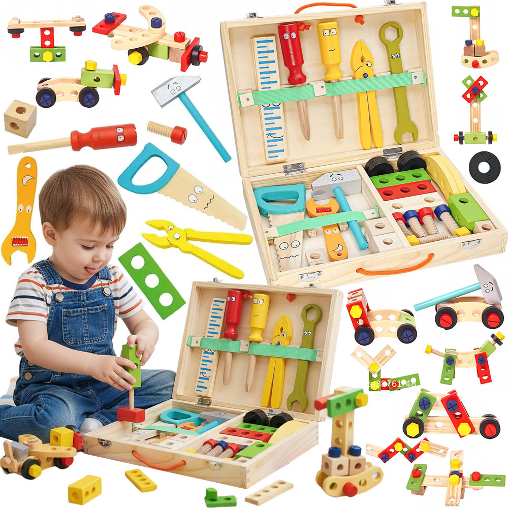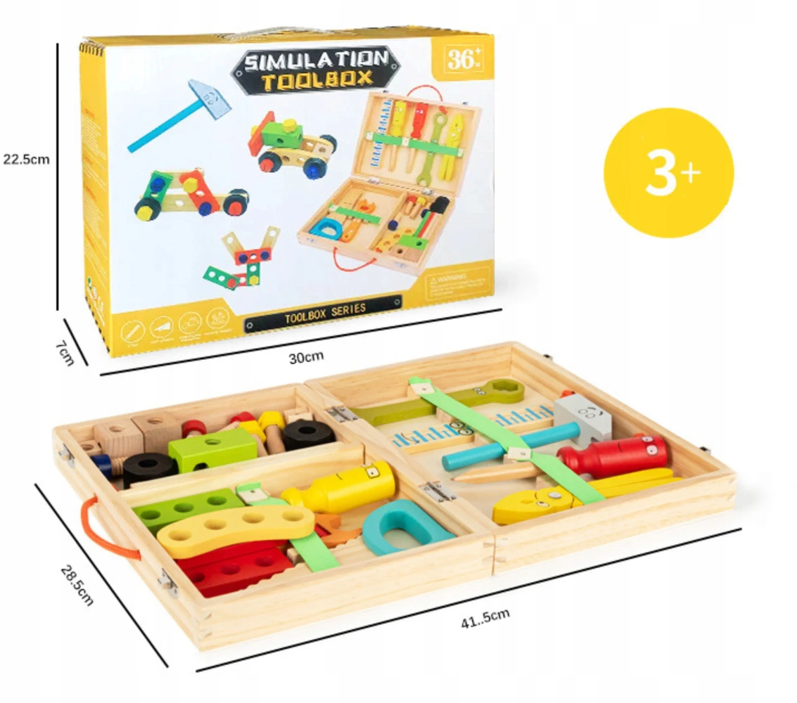 - Walizka z narzędziami dla dzieci – 35 elementów drewnianych narzędzi w walizce majsterkowicza. Zabawka edukacyjna, rozwój motoryki, kreatywność, idealny prezent.