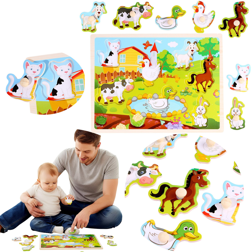 • Drewniane klocki edukacyjne puzzle FARMA – bezpieczna, interaktywna zabawka dla dzieci od 3 lat.