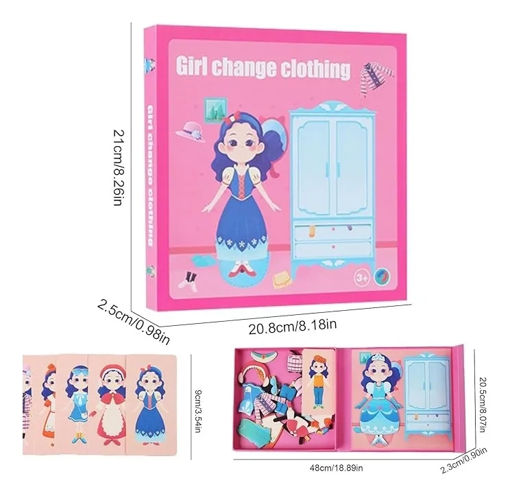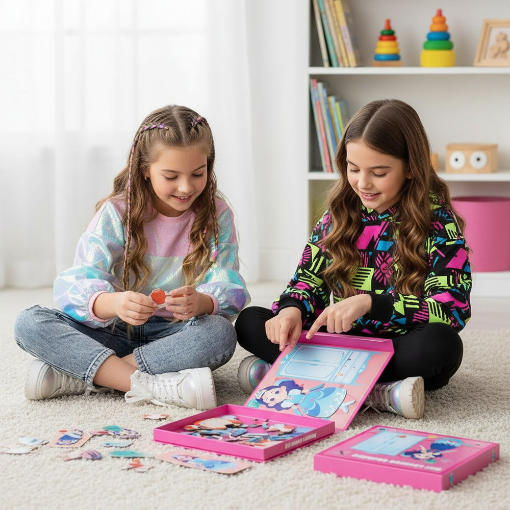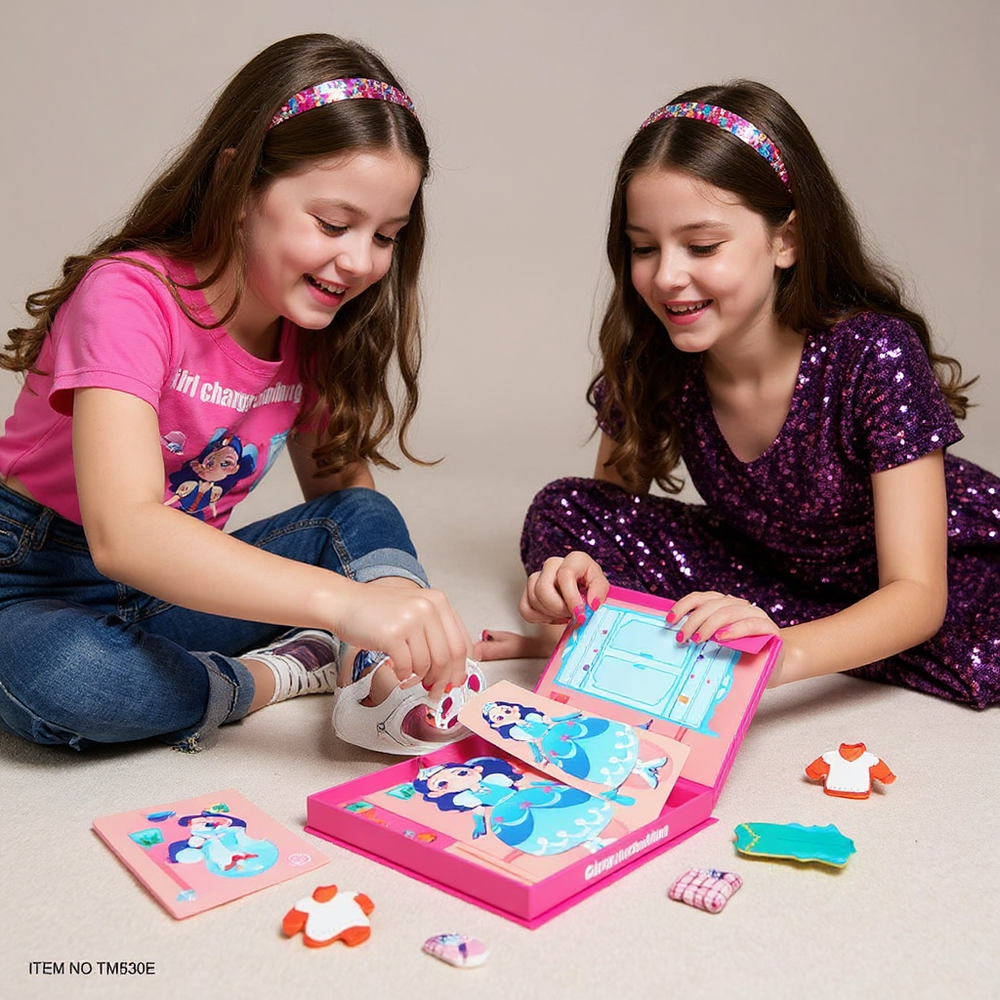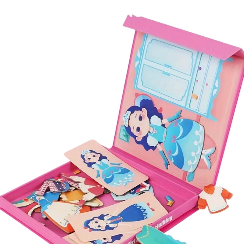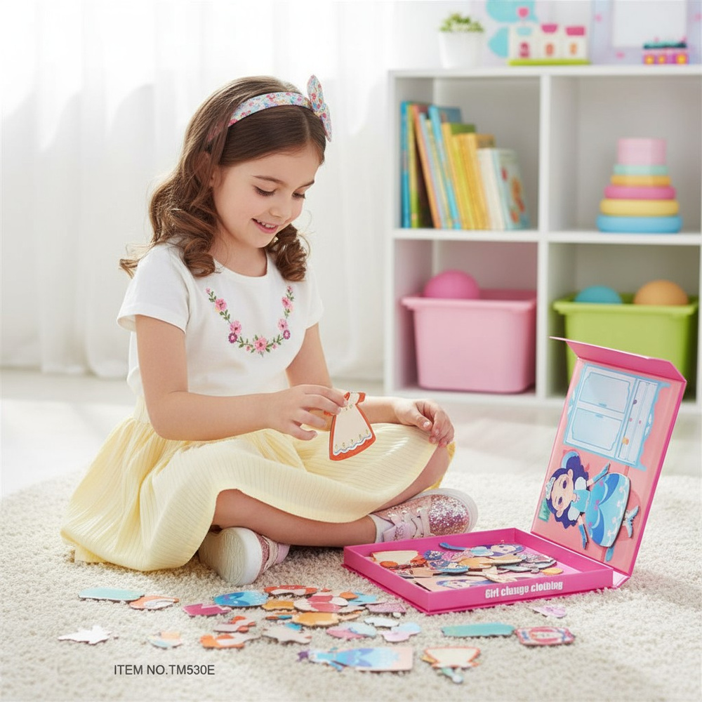 Zestaw łączy funkcje puzzli, książeczki i magnesów – to idealna zabawka edukacyjna dla każdej małej stylistki.