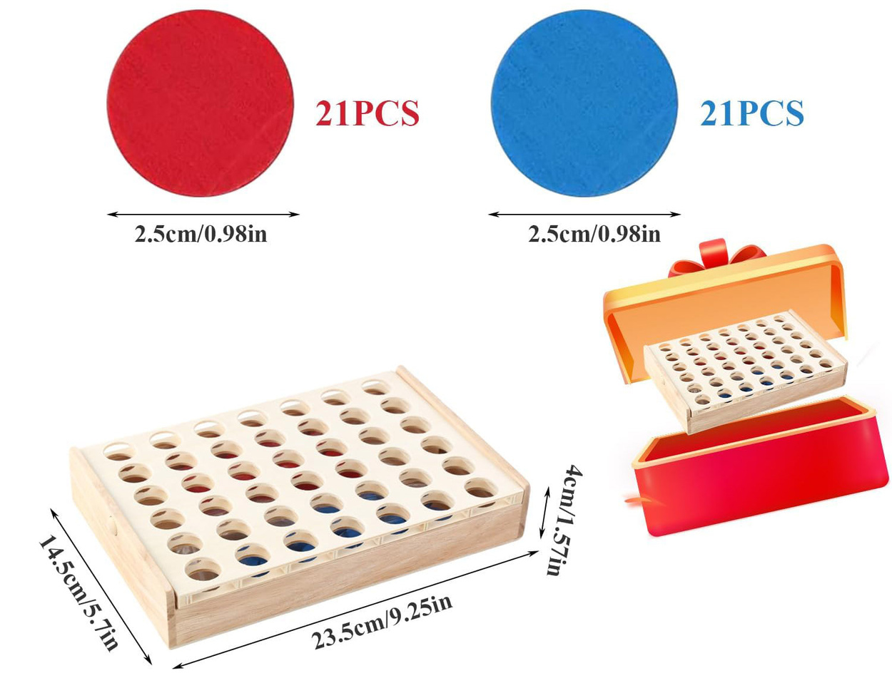 - Plansza oraz żetony wykonane są z trwałego, gładko szlifowanego drewna, bez ostrych krawędzi.