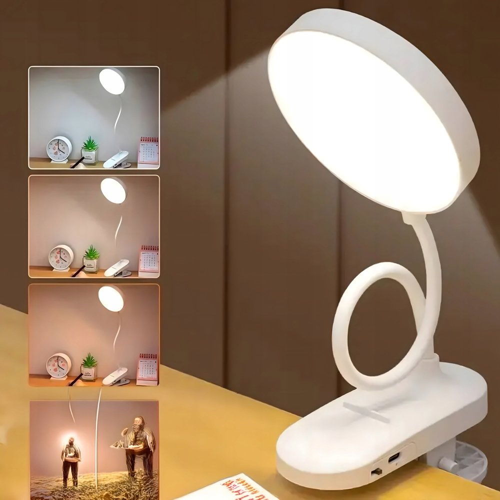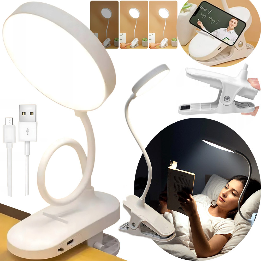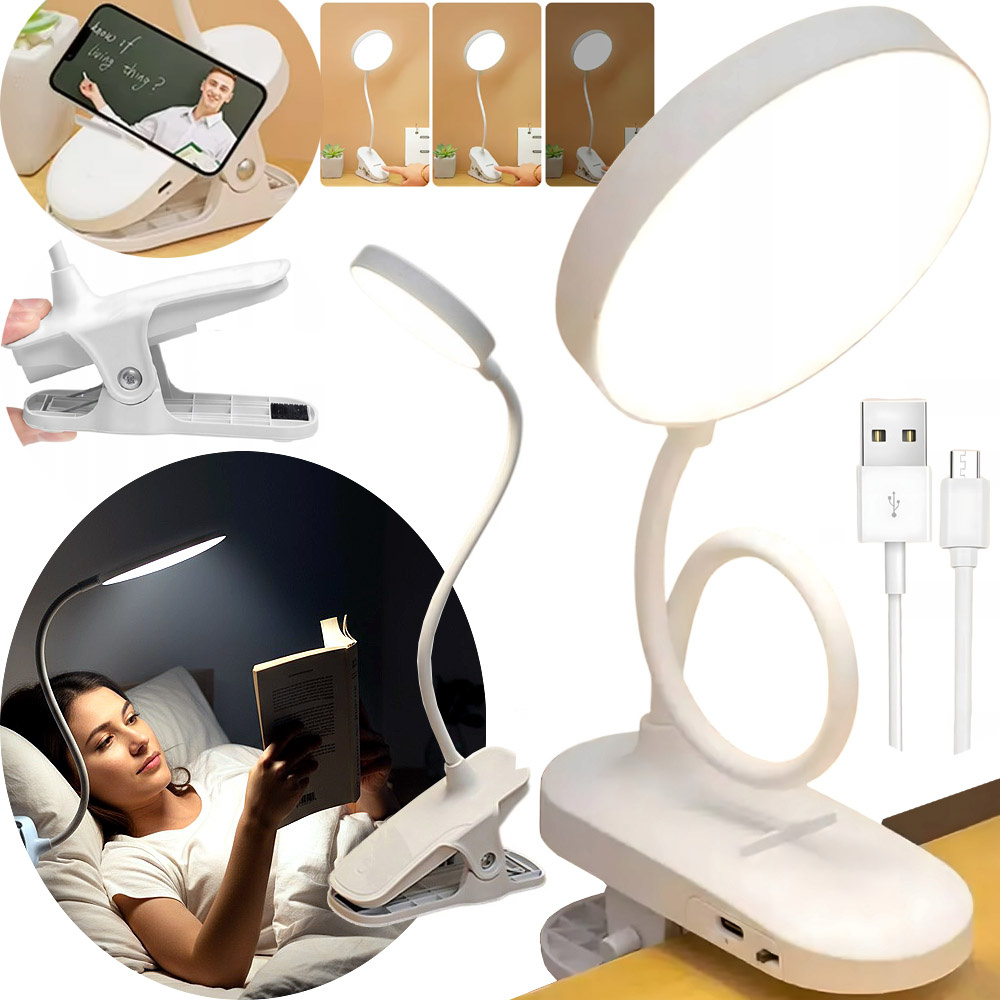 Lampka biurkowa z klipsem, przenośna lampka do czytania z możliwością ładowania przez USB i regulacją jasności, odpowiednia do czytania i nauki