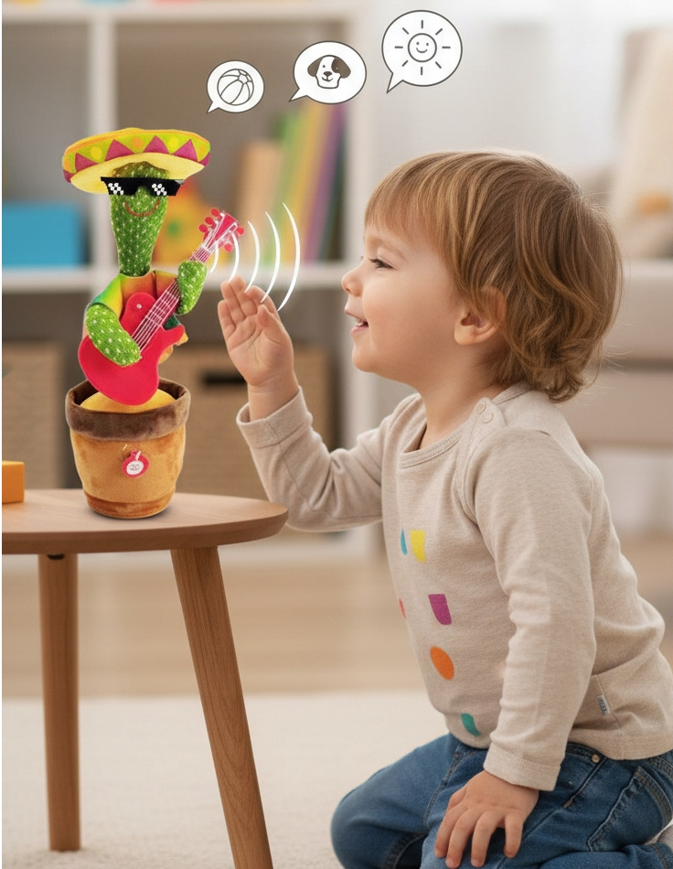 6. Rozwój zmysłów i umiejętności – Dzięki funkcji powtarzania słów oraz muzyce, zabawka stymuluje rozwój słuchu, mowy i motoryki u dzieci. Ruchy kaktusa i jego muzykalność pomagają w rozwijaniu wyobraźni oraz kreatywności najmłodszych.