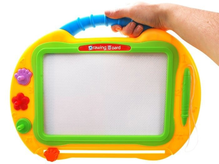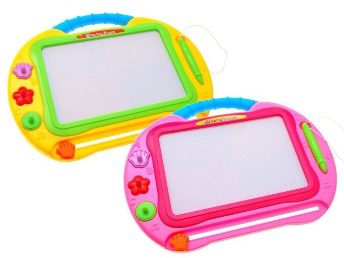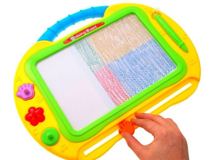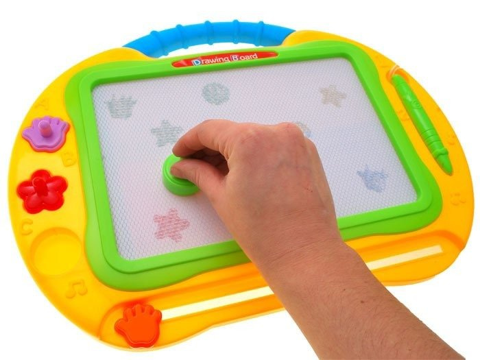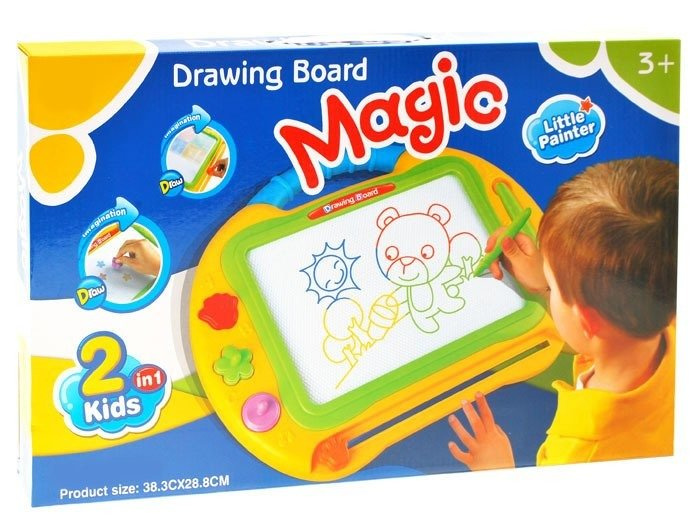 Tło tablicy jest wielokolorowe podczas rysowania zmienia się w zależności od miejsca pisania lub malowania. Pieczątki służą także do malowania. Jeśli rysunek nam się znudzi lub nie spodoba można go po prostu zmazać przy pomocy przesuwalnego mazaka w kształcie rączki. Zabawa znikopisem będzie świetnym rozwiązaniem na nudne wieczory.