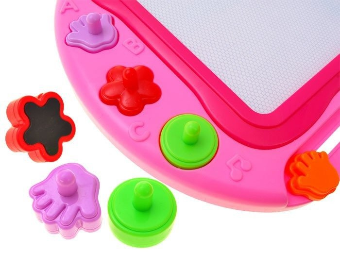 Na tablicy można malować, pisać rysikiem lub nabijać wzorki pieczątkami. Pieczątki imitujące łapkę, kwiatuszka i kółeczko odbijają piękne kolorowe wzorki. Kreatywność i pomysłowość pozwoli na stworzenie przeróżnych kształtów i postaci.