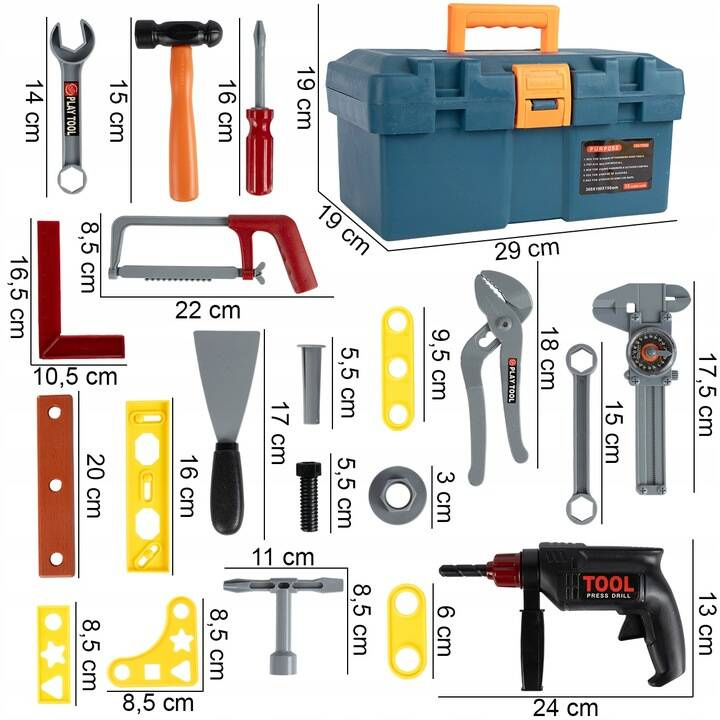 Solidna, profesjonalna skrzynka z narzędziami dla prawdziwego majsterkowicza, idealnie nadająca się na prezent. Doskonała jakość zarówno wykonania jak i użytych do produkcji materiałów, solidne i dokładne odzwierciedlenie prawdziwych narzędzi sprawi, że Twoja pociecha poczuje się jak prawdziwy majsterkowicz.